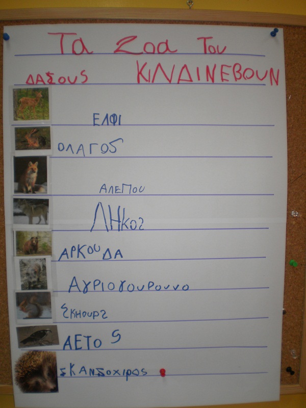Στη συνέχεια με αφορμή όσα είπε ένα παιδί για τον μπαμπά του που κυνηγάει αγριογούρουνα, μιλήσαμε για τους κινδύνους που αντιμετωπίζουν τα ζώα του δάσους : κυνηγός, άλλα ζώα, πυρκαγιές, σκουπίδια και κόψιμο δέντρων.